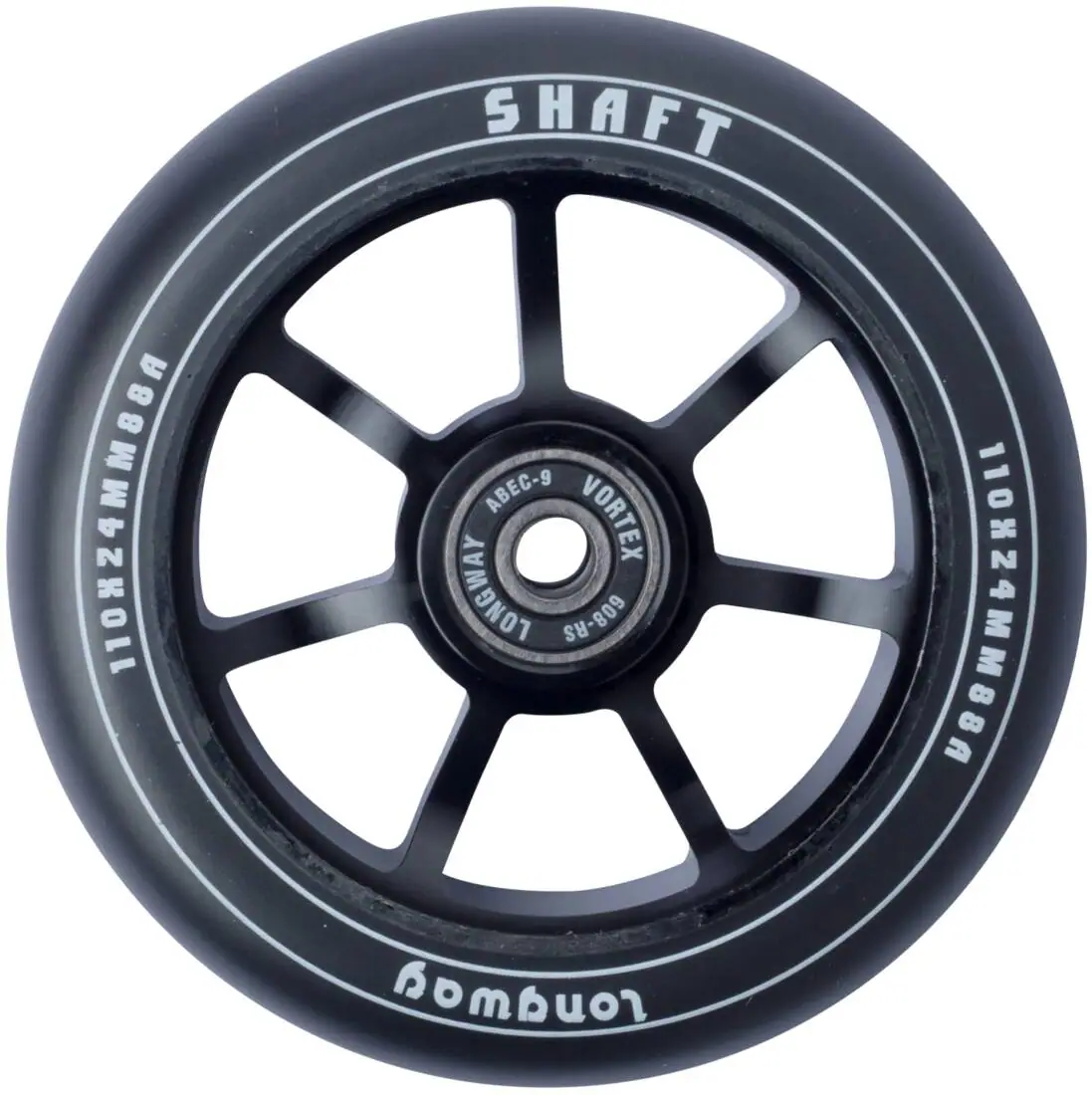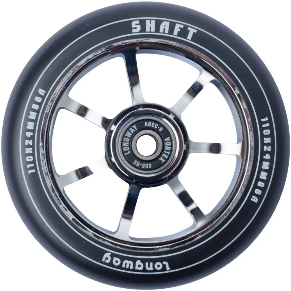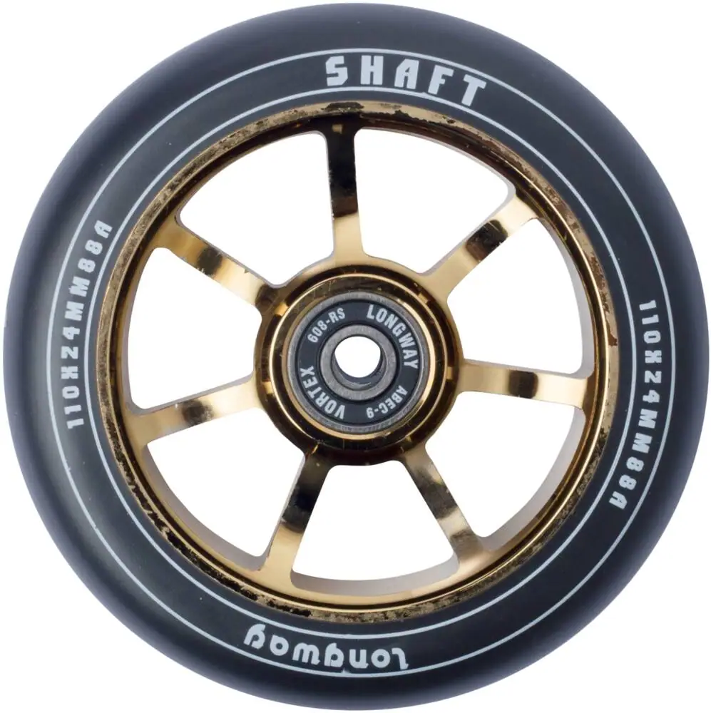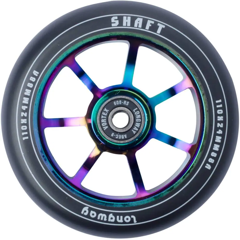 This is the Shaft pro scooter wheel from the brand Longway. Having a spoked core that is made of 6061-T6 aluminum, the wheel is classic looking and it has all the right properties such as low weight and durability. Moreover the durometer of 88A attests to the wheel’s perfect mix of grip and speed, making it great for both street and park riding. Longway has designed the wheel with a round profile to give you a stable wheel with less friction and thereby adding speed to your performances.