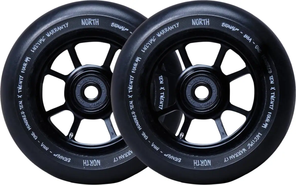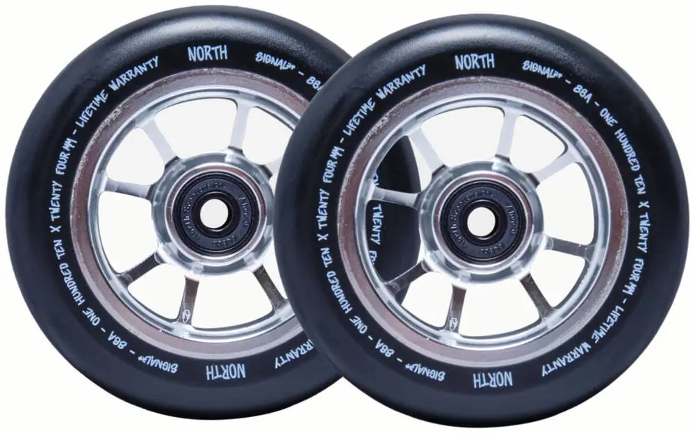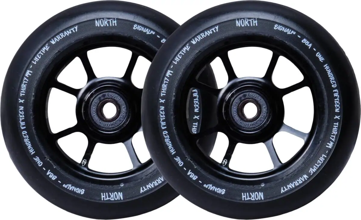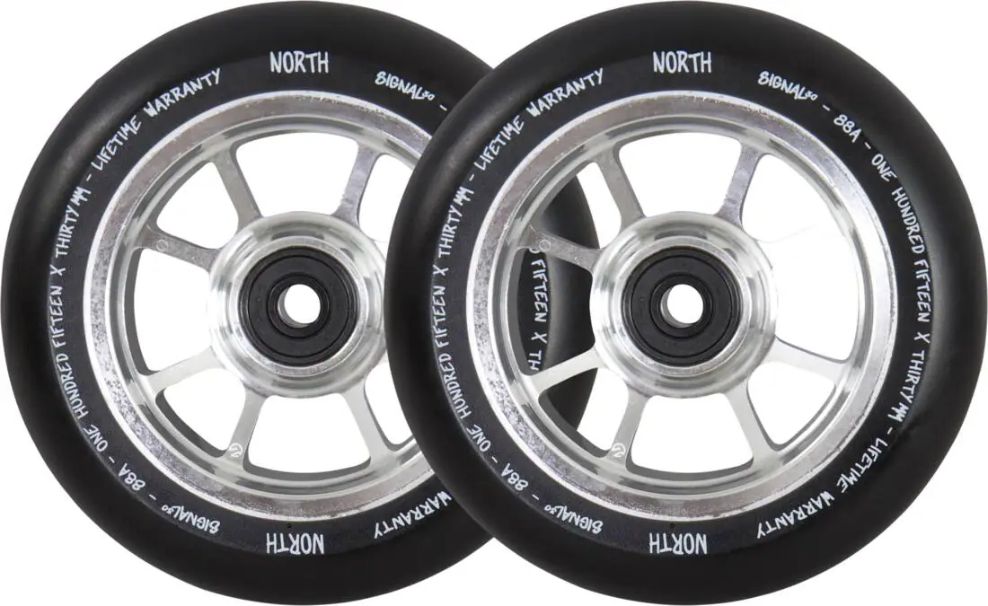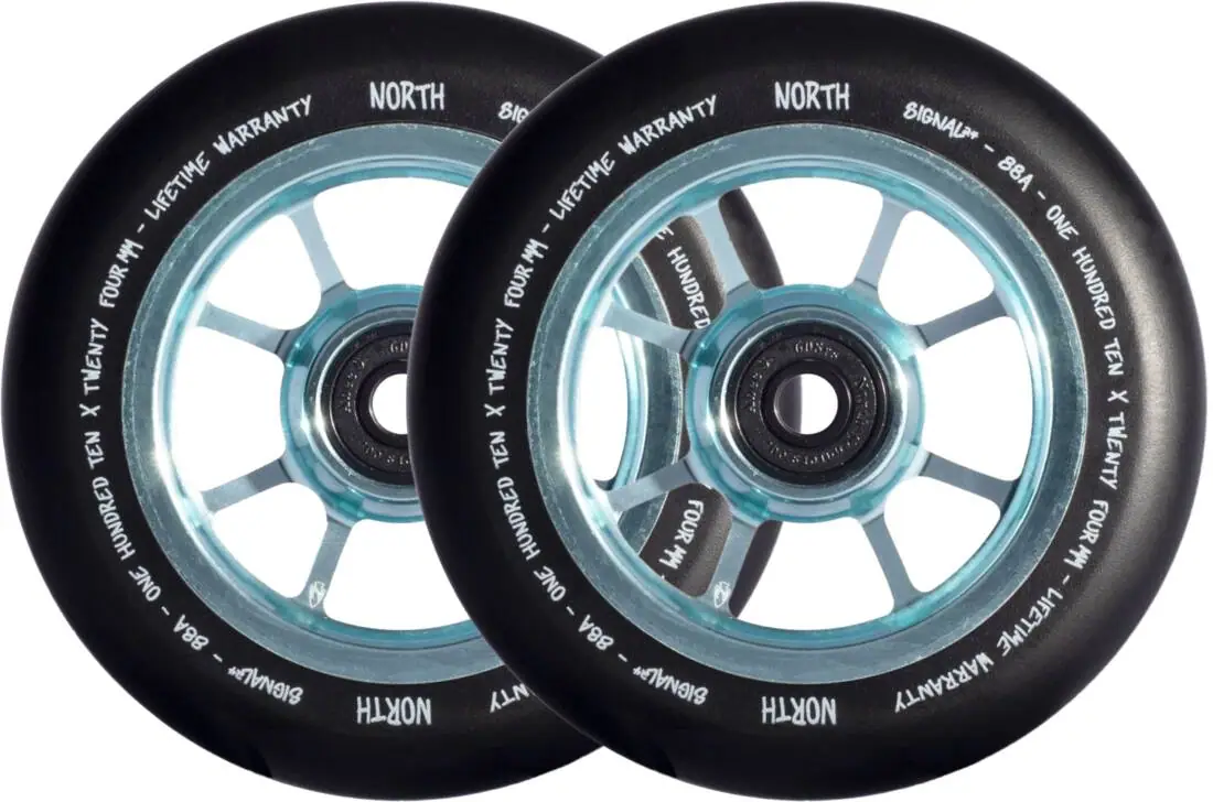Blasting out of the factory and rolling in fresh for the season is the Signal Pro Scooter Wheels made by North Scooters. Born with fast ABEC9 bearings and a nice PU formula that hits the sweet spot between grip/slip.