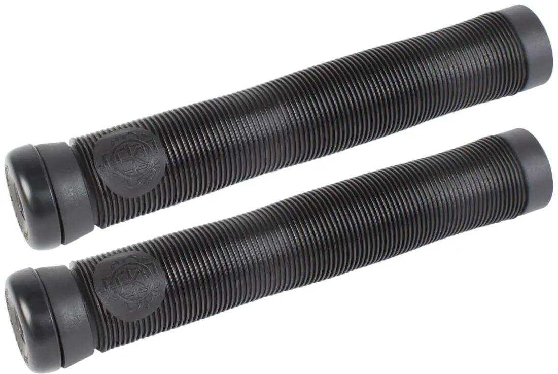 The Odyssey Warnin are freestyle BMX grips with a lot of value for money. Having flangeless grips will help you to grab your bar confidently when doing barspins. People who prefer a lot of space to move their hands around are going to be pleased with these long Odyssey grips that measure 16.5 cm. The soft rubber material gives a nice comfy grip for cruising or trick sessions. To round off your bar and extend the lifespan of both the bar and grips, you get a set of bar-ends that are compatible with aluminum and steel bars along with the grips.